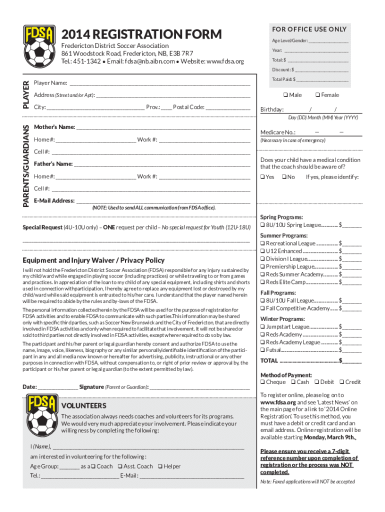 2014 REGISTRATION FORM Fredericton District Soccer Association 861 Woodstock Road, Fredericton, NB, E3B 7R7 Tel.: 4511342 Email: fdsa@nb.aibn.com Website: www.fdsa.orgFOR OFFICE USE ONLY Age Level/Gender:___