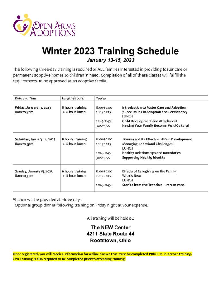 Winter 2023 Training Schedule January 1315, 2023The following three-day training is required of ALL families interested in providing foster care or permanent adoptive homes to children in need. Completion