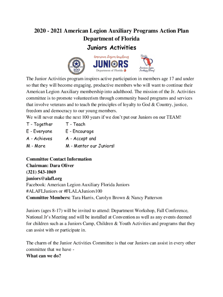 2020 2021 American Legion Auxiliary Programs Action Plan Department of Florida Juniors Activities Junior Activities program inspires active participation in members age 17 and under so that they will