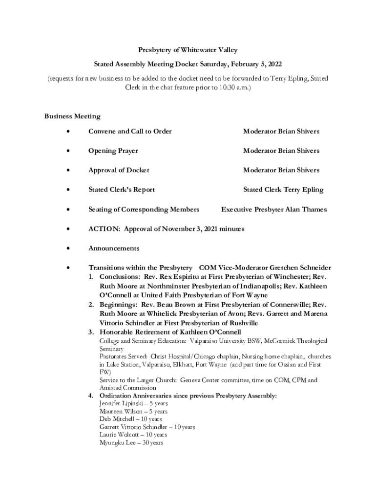 Stated Assembly Meeting Docket Saturday, February 5, 2022