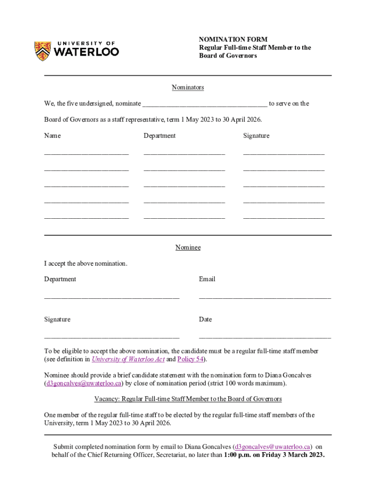 NOMINATION FORM Regular Full time Staff Member to the Board of GovernorsNominators We, the five undersigned, nominate ___ to serve on the Board of Governors as a staff representative, term 1 May 2023