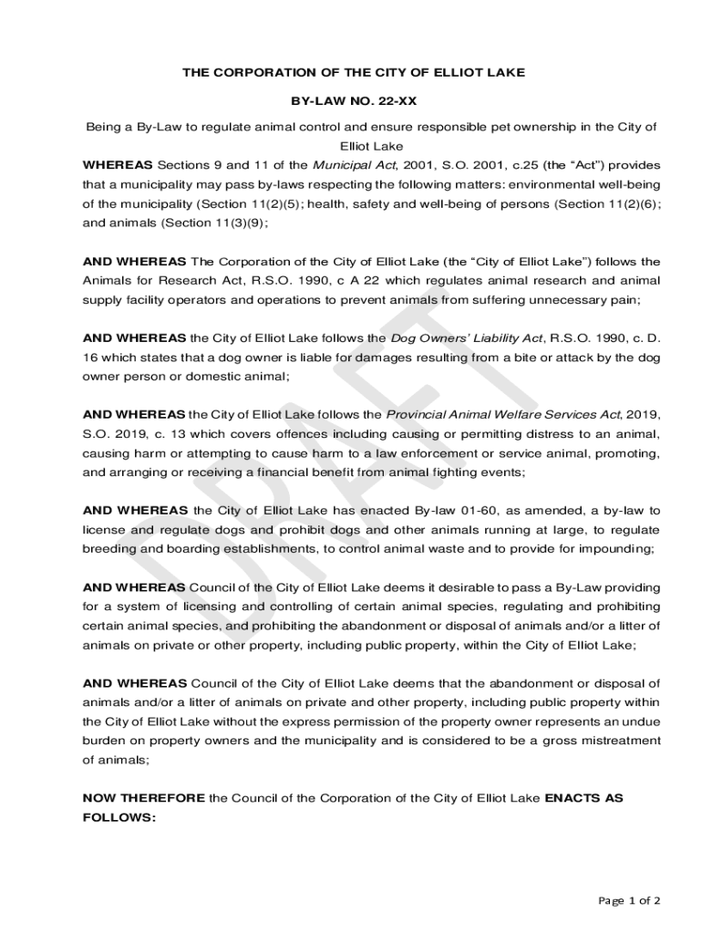 THE CORPORATION OF THE CITY OF ELLIOT LAKE BYLAW NO. 22XX Being a Bylaw to regulate animal control and ensure responsible pet ownership in the City of Elliot Lake WHEREAS Sections 9 and 11 of the