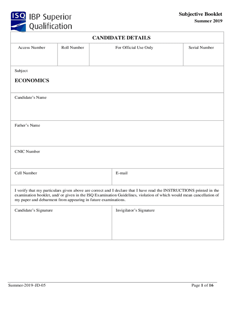 Subjective Booklet Summer 2019CANDIDATE DETAILS Access NumberRoll Number Official Use OnlySerial NumberSubjectECONOMICS Candidates Name Fathers Numeric Numbered NumberEmailI verify that my particulars
