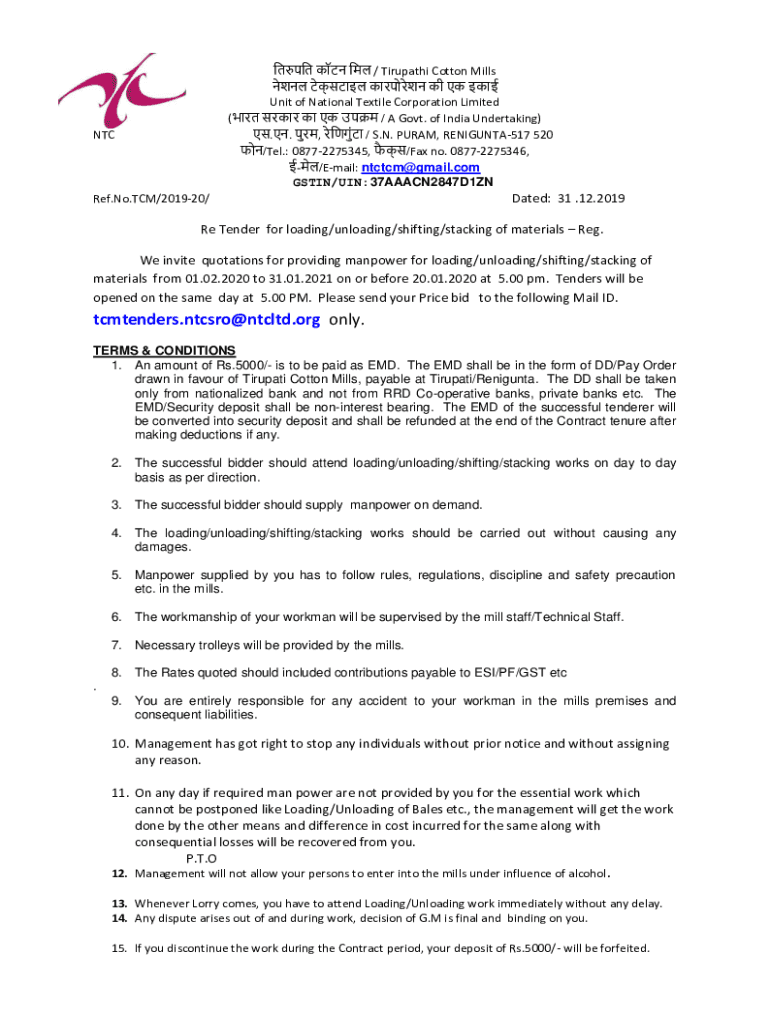 Tender for loadingunloadingshiftingstacking of can be filled out by following the instructions provided in the tender document and submitting all required information and documents.