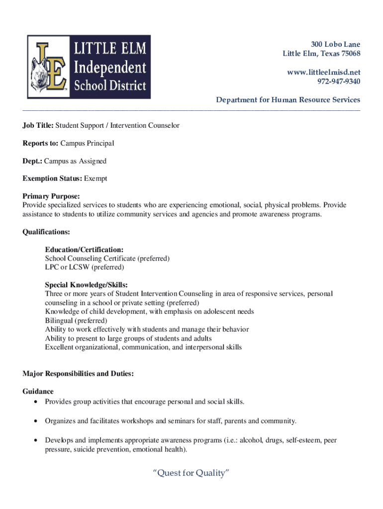 300 Logo Lane Little Elm, Texas 75068 www.littleelmisd.net 9729479340 Department for Human Resource Services ___Job Title: Student Support / Intervention Counselor Reports to: Campus Principal Dept.: