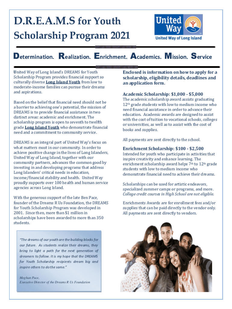 D.R.E.A.M.S for Youth Scholarship Program 2021 Determination. Realization. Enrichment. Academics. Mission. Service United Way of Long Islands DREAMS for Youth Scholarship Program provides financial
