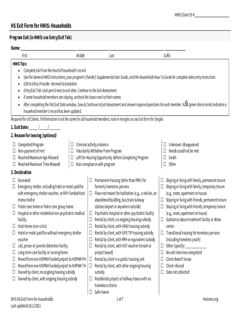 HIS Client ID #HS Exit Form for HIS: Households Program Exit (in HIS: use Entry/Exit Tab) Name: FirstMiddleLastSuffixHMIS Tips: Complete Exit from the head of households record Use the General HIS