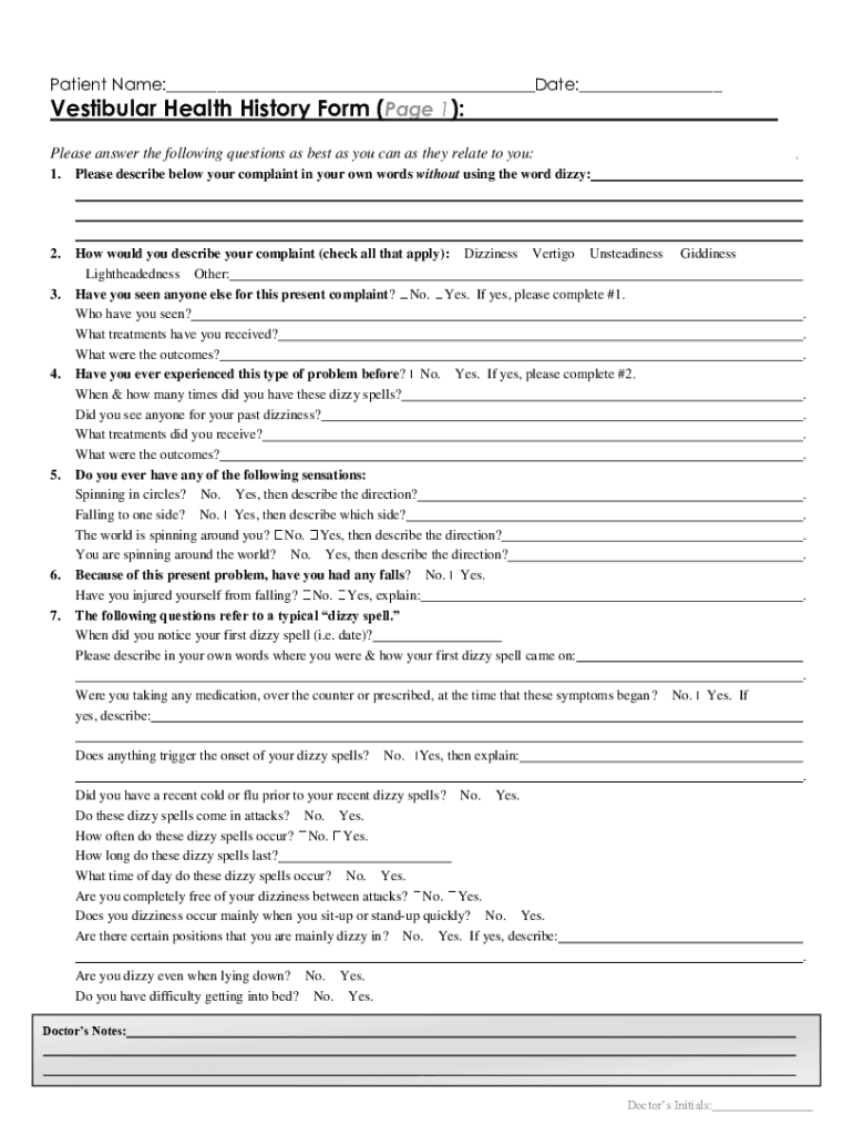 Patient Name:___Date:___Vestibular Health History Form (Page 1): Please answer the following questions as good as you can as they relate to you:.1. Please describe below your complaint in your own