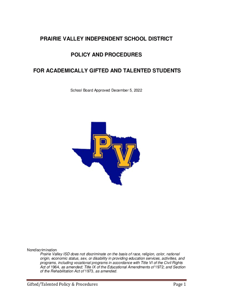 PRAIRIE VALLEY INDEPENDENT SCHOOL DISTRICT POLICY AND PROCEDURES FOR ACADEMICALLY GIFTED AND TALENTED STUDENTSSchool Board Approved December 5, 2022Nondiscrimination Prairie Valley ISD does not discriminate