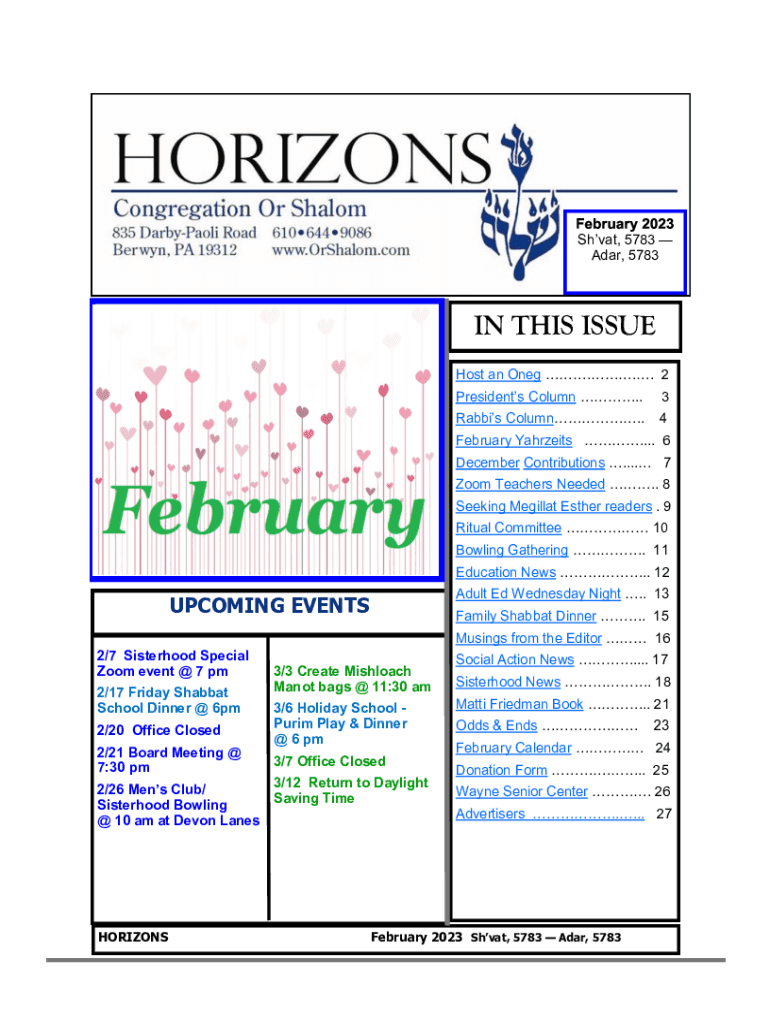 Shevat, 5783 Adar, 5783IN THIS ISSUE. . Host a One ... 2. Presidents Column .3Rabbis Column.4February Yahrzeits .... 6December Contributions .... 7 Zoom Teachers Needed. 8 Seeking McMillan Esther