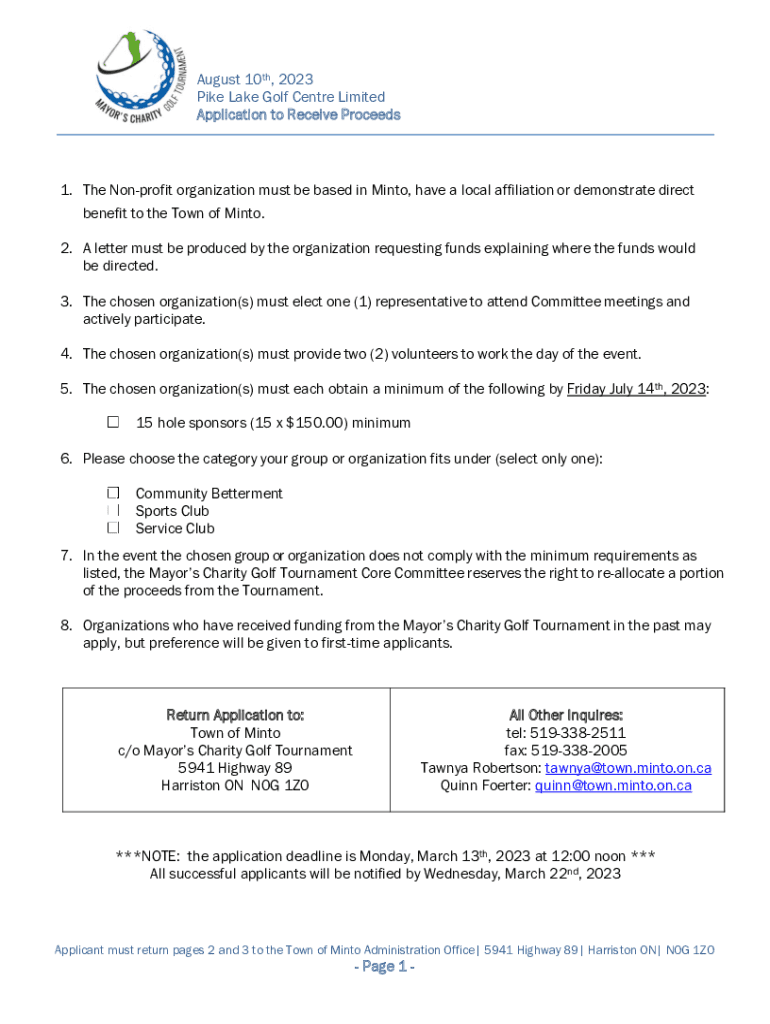 August 10th, 2023 Pike Lake Golf Center Limited Application to Receive Proceeds1. The Nonprofit organization must be based in Into, have a local affiliation or demonstrate direct benefit to the Town