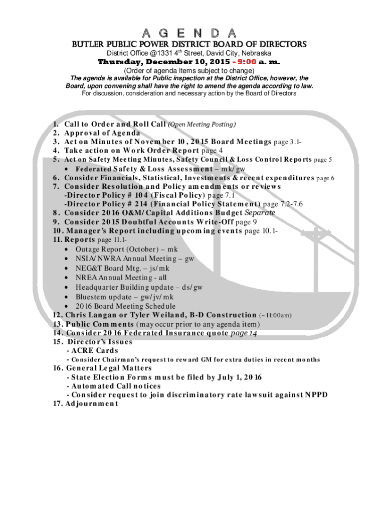 A G E N D A BUTLER PUBLIC POWER DISTRICT BOARD OF DIRECTORS Districts Office @1331 4th Street, David City, Nebraska Thursday, December 10, 2015 9:00 a. m. (Order of agenda Items subject to change)