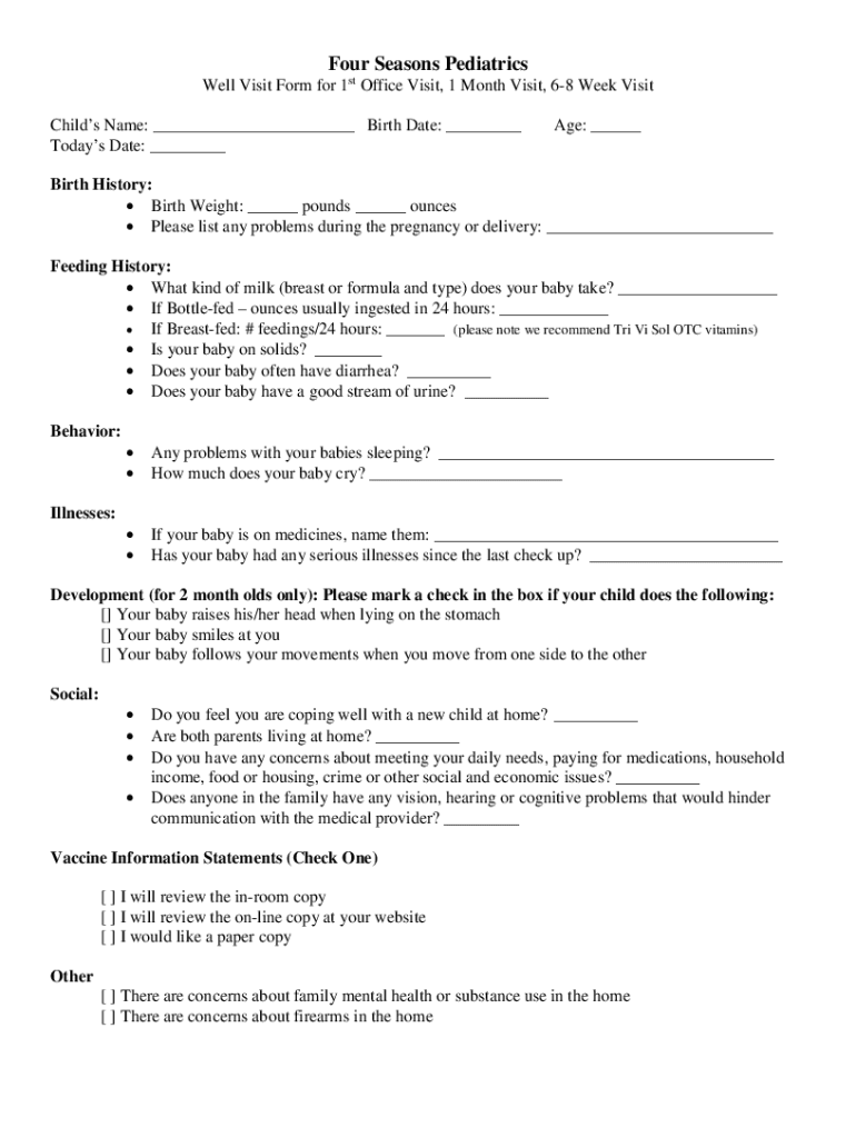 Four Seasons Pediatrics Well Visit Form for 1st Office Visit, 1 Month Visit, 68 Week Visit Child's Name: ___ Birth Date: ___ Today's Date: ___Age: ___Birth History: Birth Weight: ___ pounds ___ ounces