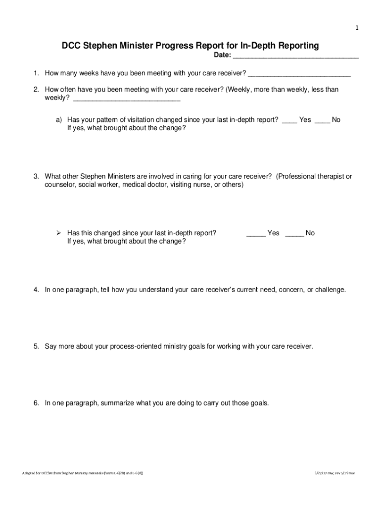 The DCC Stephen Minister progress report can typically be filled out online through a designated reporting platform provided by the Stephen Ministry organization.