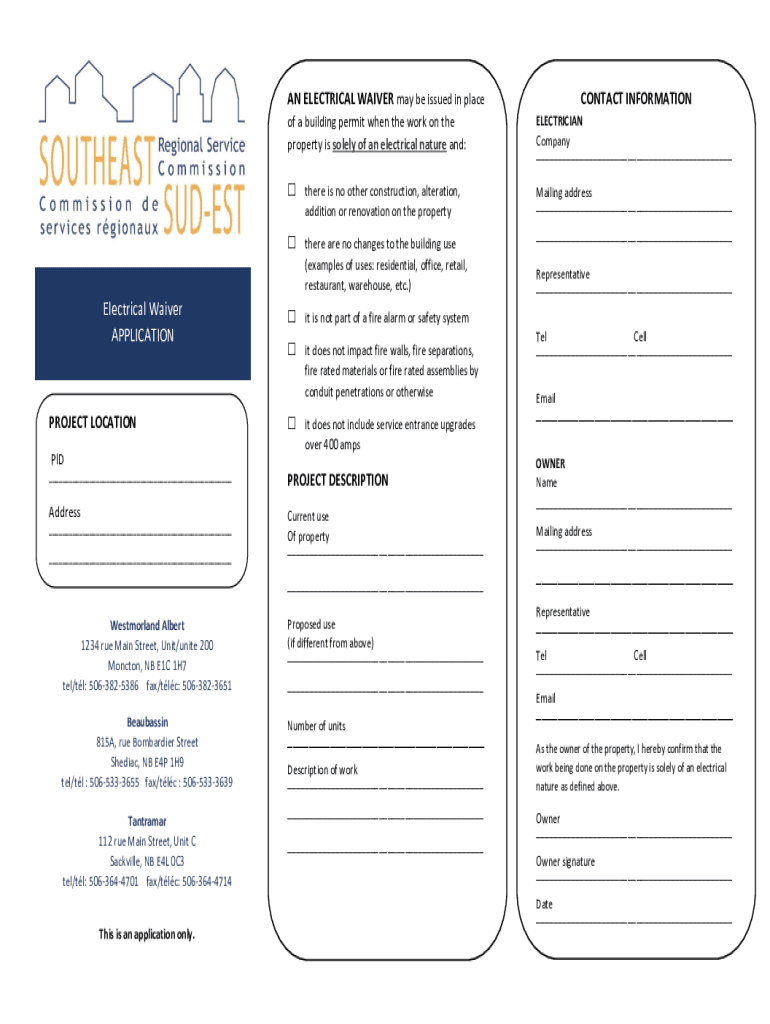 AN ELECTRICAL WAIVER may be issued in place of a building permit when the work on the property is solely of an electrical nature and: Electrical Waiver APPLICATIONPROJECT LOCATION PID there is no