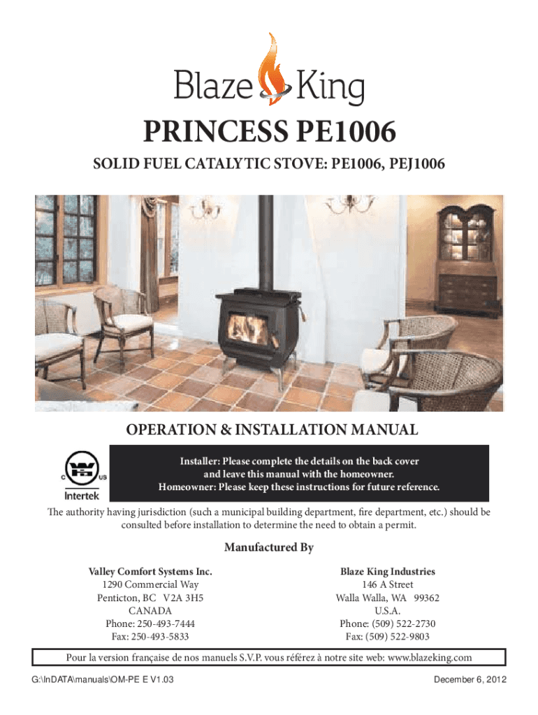 Get the free Blaze King PRINCESS PE1006 Operation & Installation ...