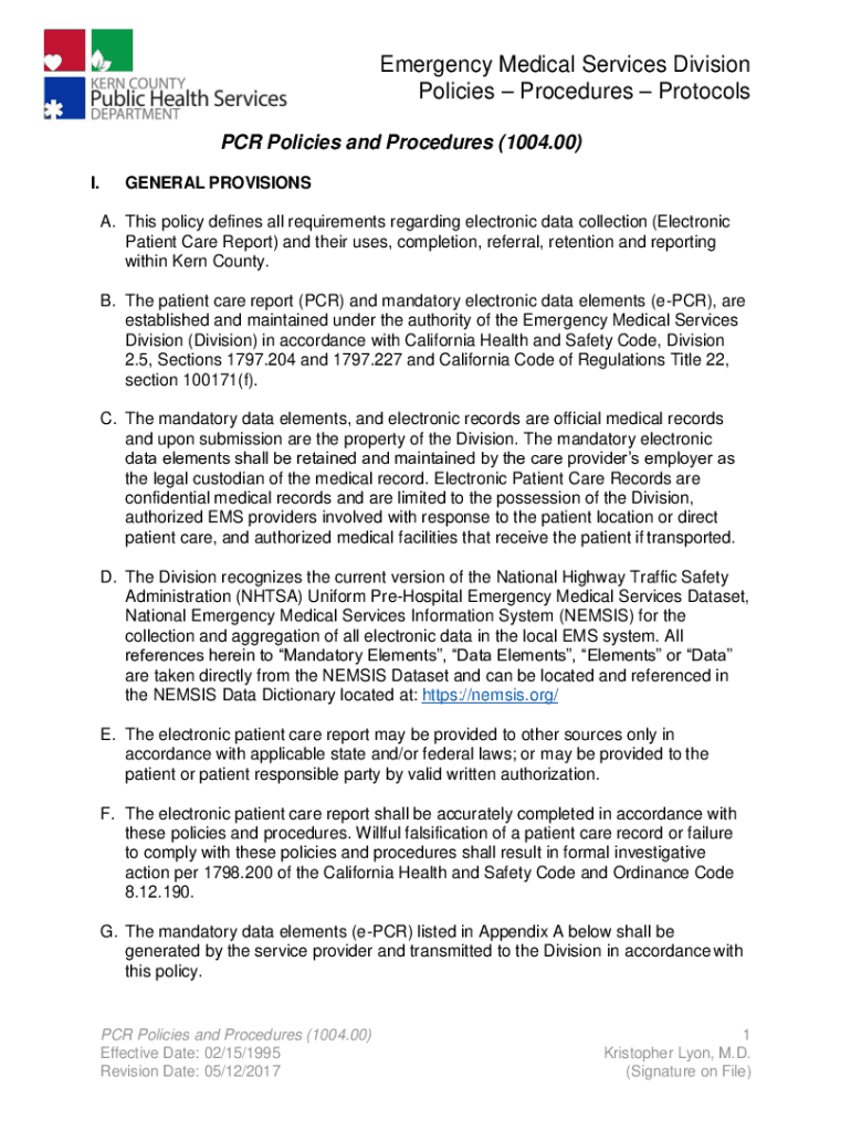 Emergency Medical Services Division Policies Procedures Protocols PCR Policies and Procedures (1004.00) I.GENERAL PROVISIONS A. This policy defines all requirements regarding electronic data collection