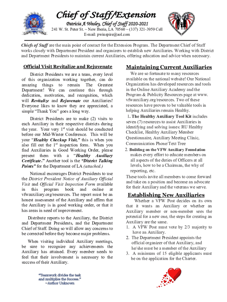 Patricia A Wesley, Chief of Staff 20202021241 W. St. Peter St. New Iberia, LA 70560 (337) 3213959 Cell Email: pwinspire@aol.comChiefs of Staff are the main point of contact for the Extension Program.