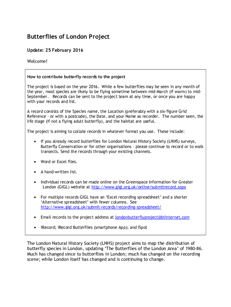 Butterflies of London Project Update: 25 February 2016 Welcome! How to contribute butterfly records to the project is based on the year 2016. While a few butterflies may be seen in any month of the