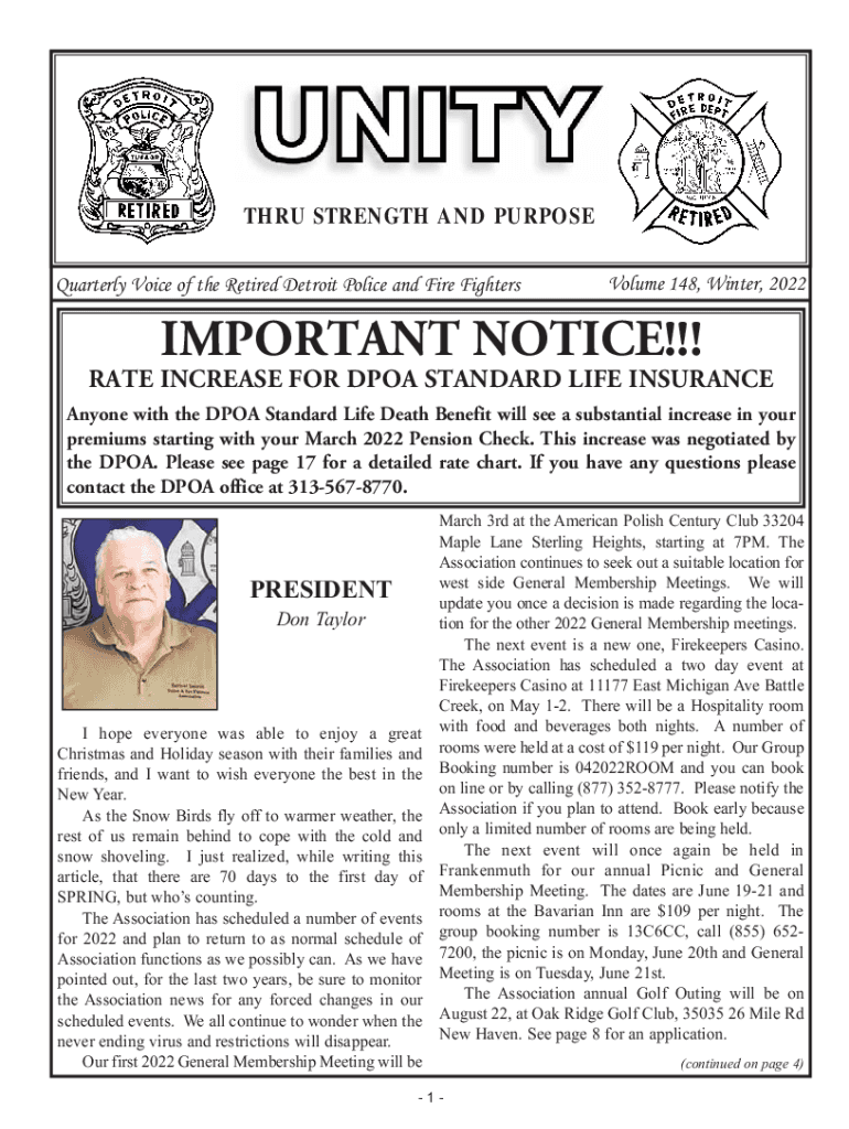 Through STRENGTH AND PURPOSE Quarterly Voice of the Retired Detroit Police and Fire FightersVolume 148, Winter, 2022IMPORTANT NOTICE!!! RATE INCREASE FOR DOA STANDARD LIFE INSURANCE Anyone with the