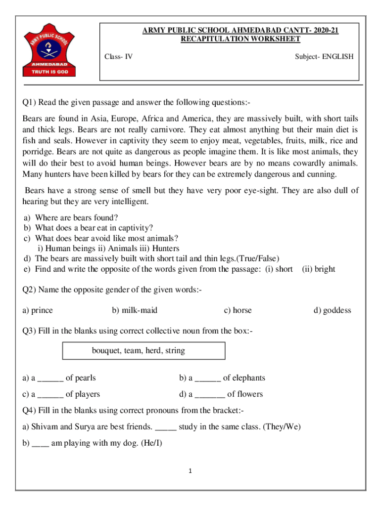 ARMY PUBLIC SCHOOL AHMEDABAD CANTO 202021 RECAPITULATION WORKSHEET Class Subject ENGLISHQ1) Read the given passage and answer the following questions:Bears are found in Asia, Europe, Africa and America,