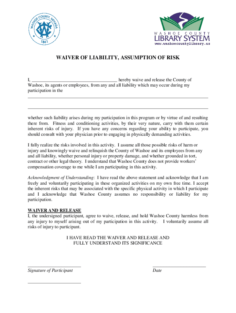 WAIVER OF LIABILITY, ASSUMPTION OF RISK, ___ hereby waive and release the County of Was hoe, its agents or employees, from any and all liability which may occur during my participation in the ___