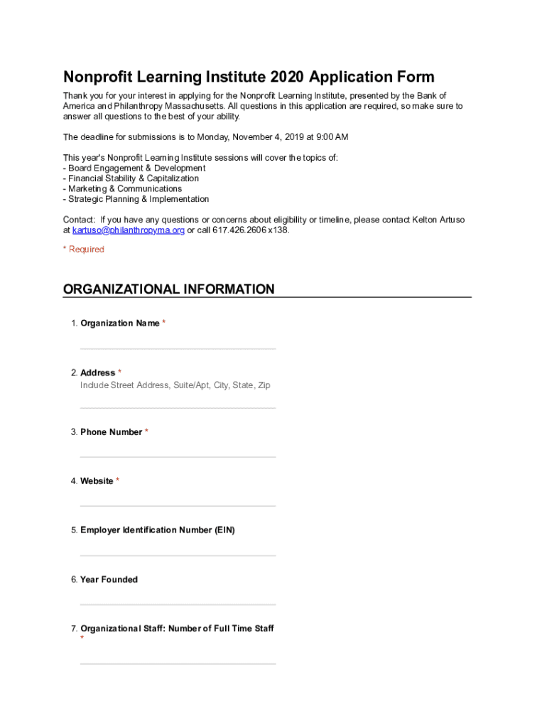 Nonprofit Learning Institute 2020 Application Form Thank you for your interest in applying for the Nonprofit Learning Institute, presented by the Bank of America and Philanthropy Massachusetts. All
