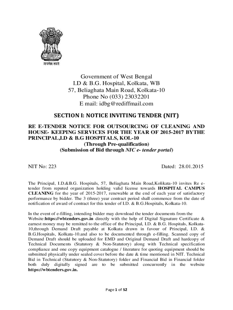 Government of West Bengal I. D & B.G. Hospital, Kolkata, WB 57, Beliaghata Main Road, Kolkata10 Phone No (033) 23032201 E mail: idbg@rediffmail.com SECTION I: NOTICE INVITING TENDER (NIT) RE TENDER