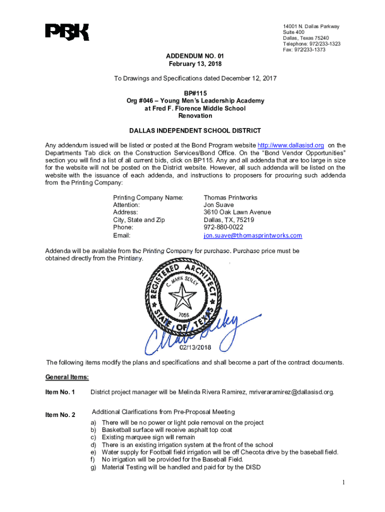 14001 N. Dallas Parkway Suite 400 Dallas, Texas 75240 Telephone: 972/2331323 Fax: 972/2331373ADDENDUM NO. 01 February 13, 2018, To Drawings and Specifications dated December 12, 2017, BP#115 Org #046