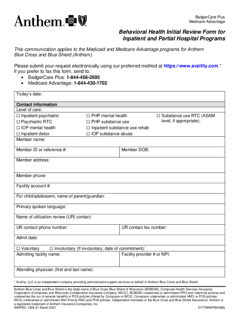 Medicare AdvantageBehavioral Health Initial Review Form for
