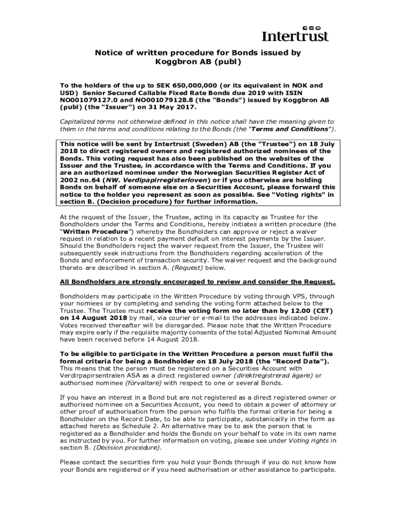 Get the free Notice of written procedure for Bonds issued by Koggbron AB ...