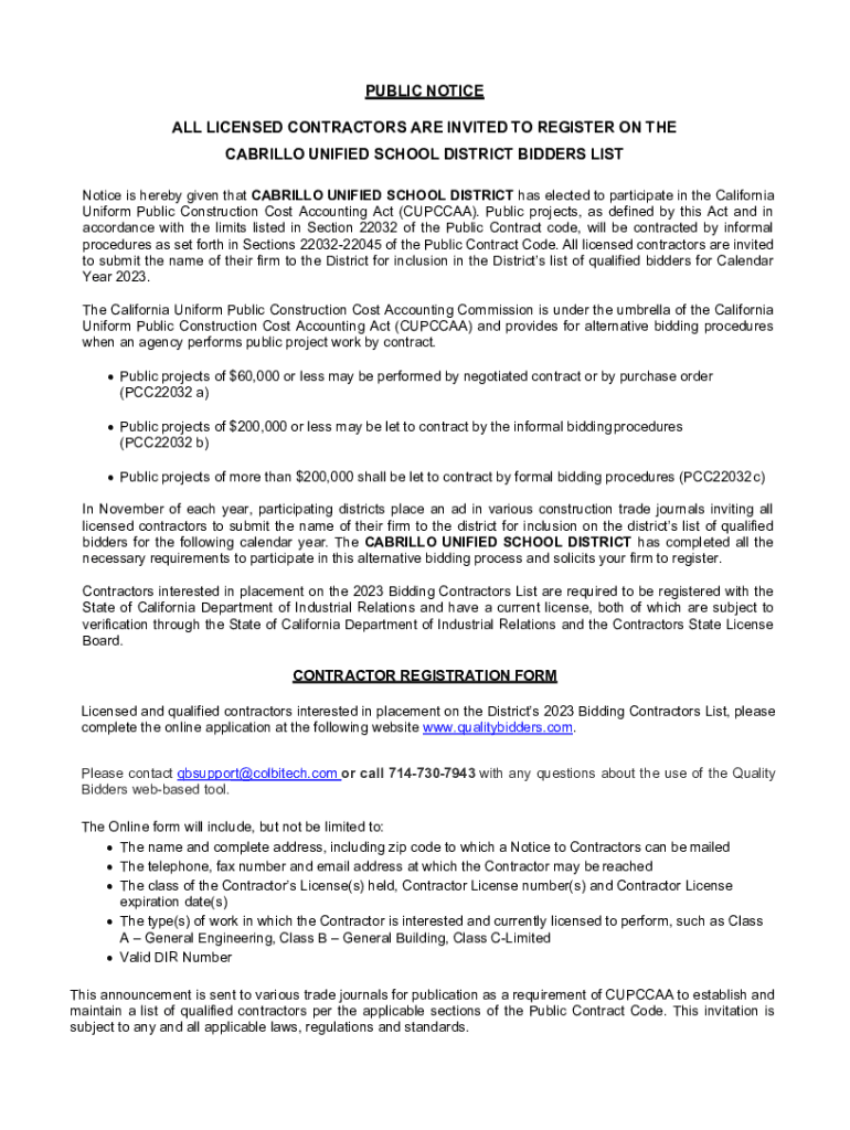 PUBLIC NOTICE ALL LICENSED CONTRACTORS ARE INVITED TO REGISTER ON THE CABRILLO UNIFIED SCHOOL DISTRICT BIDDERS LIST Notice is hereby given that CABRILLO UNIFIED SCHOOL DISTRICT has elected to participate