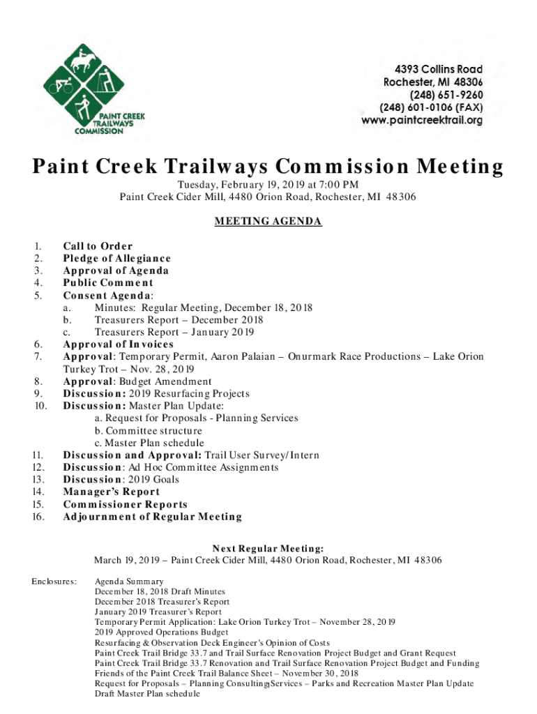 Paint Creek Trailways Commission Meeting Tuesday, February 19, 2019, at 7:00 PM Paint Creek Cider Mill, 4480 Orion Road, Rochester, MI 48306 MEETING AGENDA 1. 2. 3. 4. 5.6. 7. 8. 9. 10.11. 12. 13.