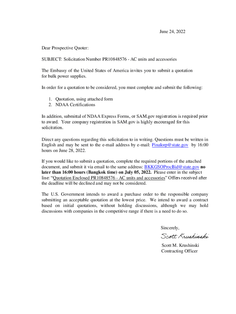 June 24, 2022Dear Prospective Quoted: SUBJECT: Solicitation Number PR10848576 AC units and accessories The Embassy of the United States of America invites you to submit a quotation for bulk power