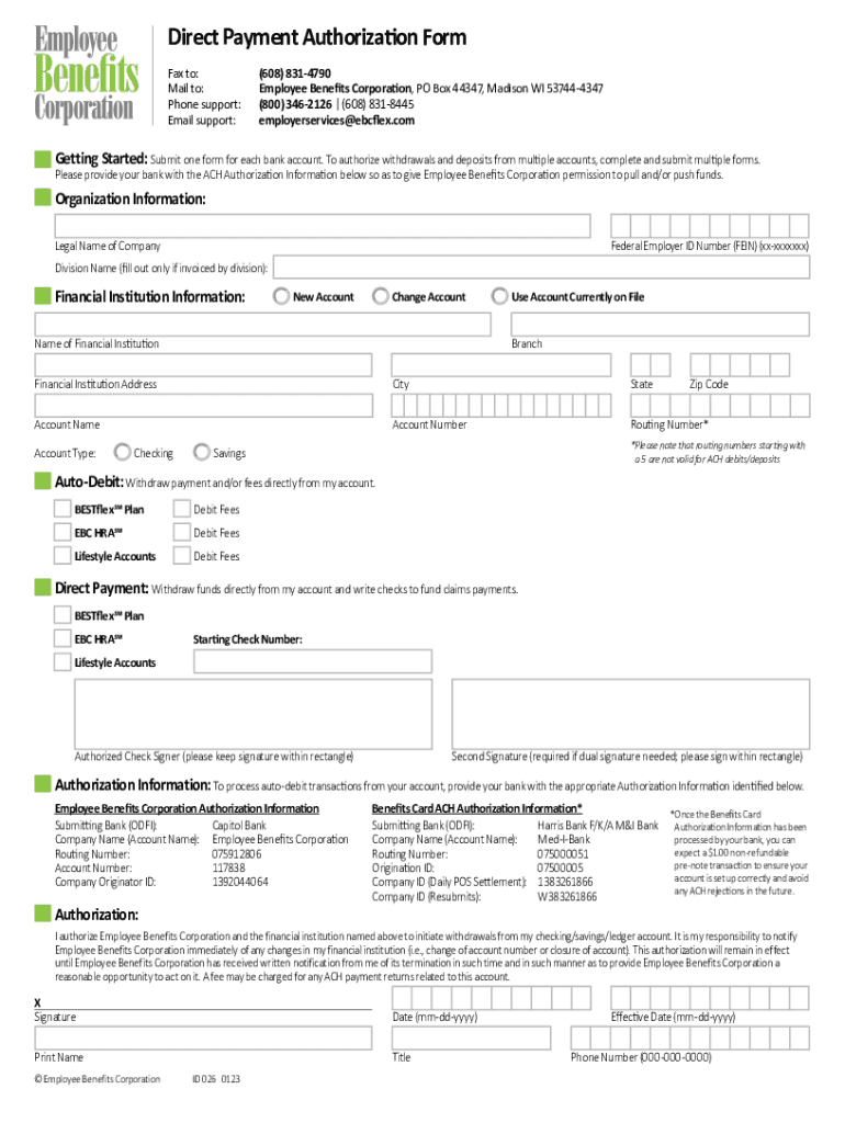 Direct Payment Authorization Format to:Mail to:Phone support:Email support:(608) 8314790 Employee Benefits Corporation, PO Box 44347, Madison WI 537444347 (800) 3462126 | (608) 8318445 employerservices@ebcflex.comGetting