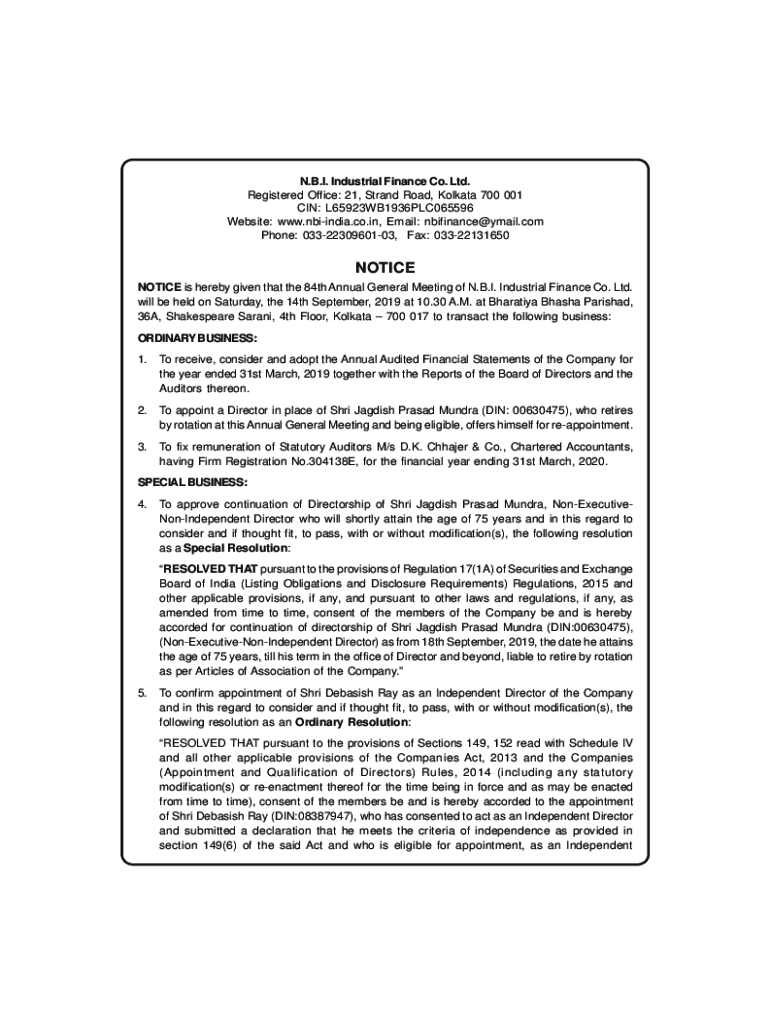 N.B.I. Industrial Finance Co. Ltd. Registered Office: 21, Strand Road, Kolkata 700 001 IN: L65923WB1936PLC065596 Website: www.nbiindia.co.in, Email: nbifinance@ymail.com Phone: 0332230960103, Fax: