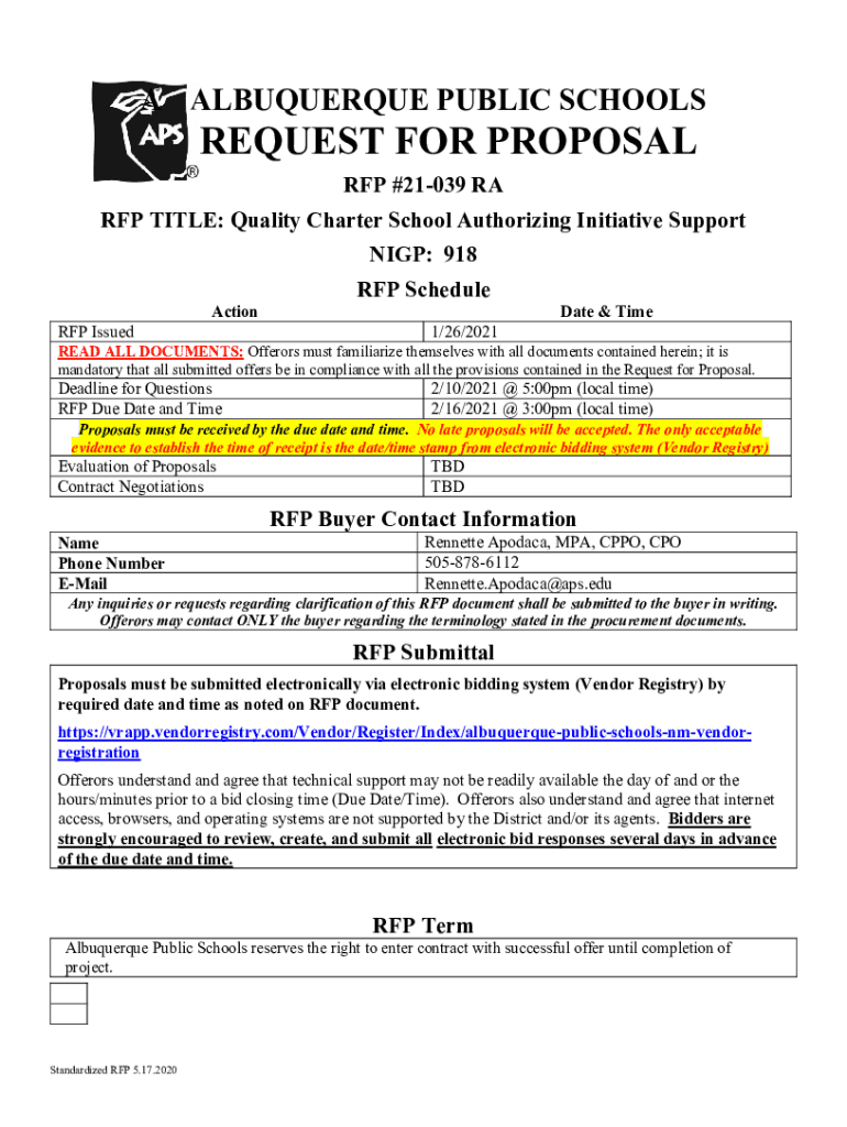 A ALBUQUERQUE PUBLIC SCHOOLSREQUEST FOR PROPOSAL RFP #21039 RAR FP TITLE: Quality Charter School Authorizing Initiative Support NIGH: 918 RFP IssuedActionRFP Schedule 1/26/2021Date & Time READ ALL