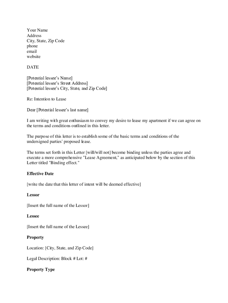 Your Name Addresses City, State, Zip Code phone email website DATE [Potential lessees Name] [Potential lessees Street Address] [Potential lessees City, State, and Zip Code] Re: Intention to Lease