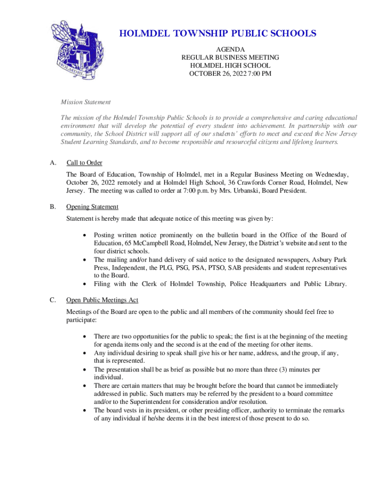 HOLDER TOWNSHIP PUBLIC SCHOOLS AGENDA REGULAR BUSINESS MEETING HOLDER HIGH SCHOOL OCTOBER 26, 2022 7:00 Mission Statement The mission of the Holder Township Public Schools is to provide a comprehensive