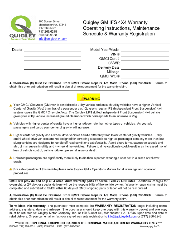 100 Sunset Drive Manchester PA, 17345717.266.5631 717.266.6248 800.233.9358 info@quigley4x4.comDealerQuigley GM IFS 4×4 Warranty Operating Instructions, Maintenance Schedule & Warranty Registration