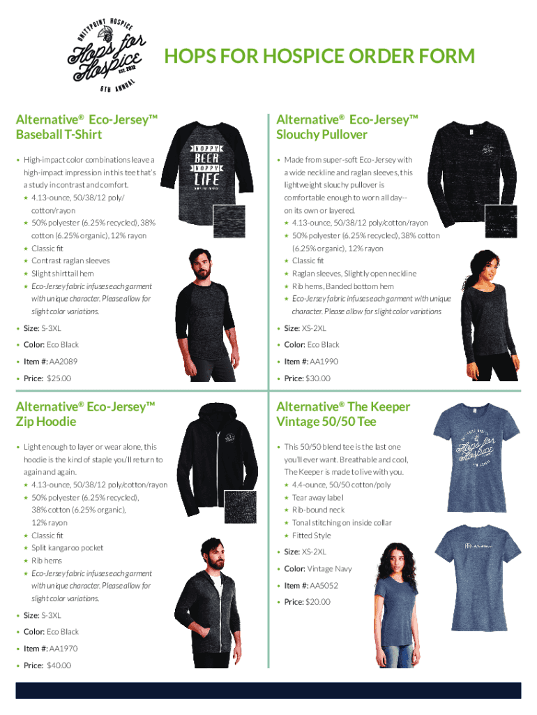 HOPS FOR HOSPICE ORDER FORM Alternative Eco Jersey Baseball TShirtAlternative Eco Jersey Slouchy Pullover High impact color combinations leave a Made from super soft Eco Jersey withhighimpact impression