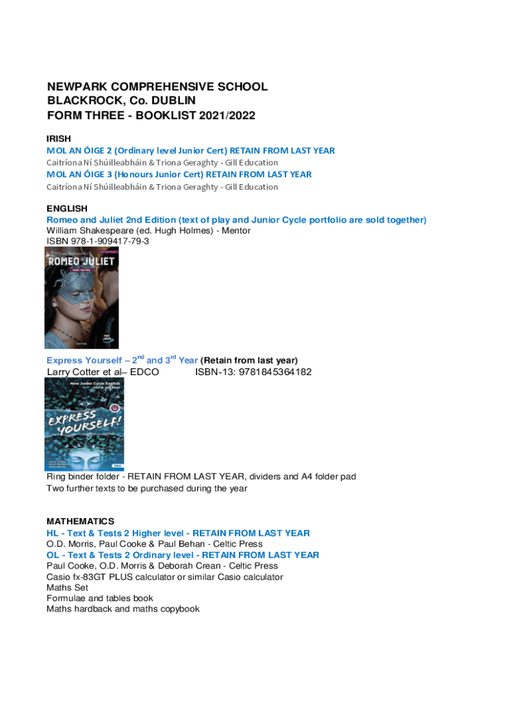 Get the free NEWPARK COMPREHENSIVE SCHOOL - gov.ie