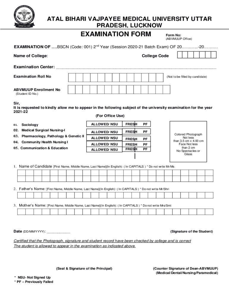 Get the free EXAMINATION FORM - Atal Bihari Vajpayee Medical University