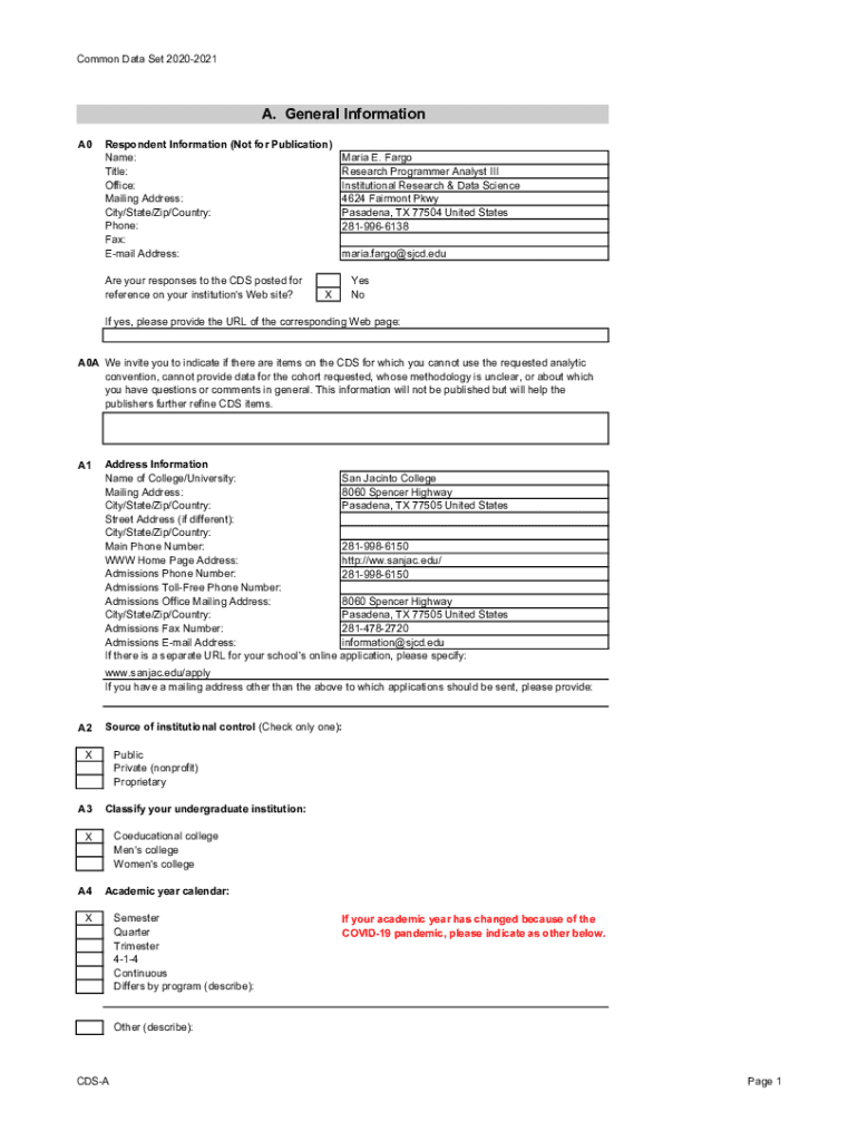 Common Data Set 20202021A. General Information A0Respondent Information (Not for Publication) Name: Title: Office: Mailing Address: City/State/Zip/Country: Phone: Fax: Email Address: Are your responses