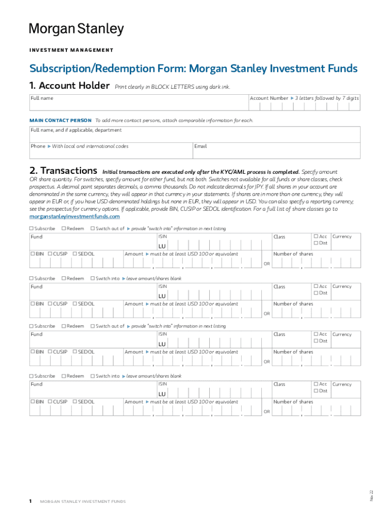 INVESTMENT MANAGEMENTSubscription/Redemption Form: Morgan Stanley Investment Funds 1. Account Overprint clearly in BLOCK LETTERS using dark ink. Full nameAccount Number3 letters followed by 7 digitsMAIN