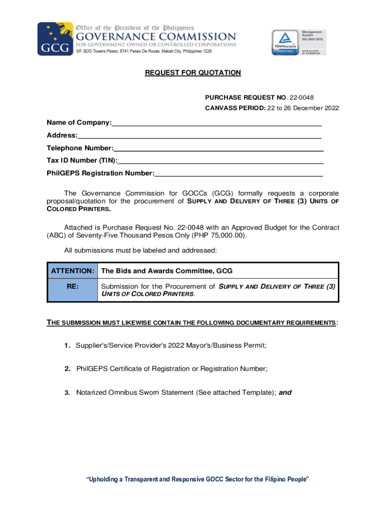 REQUEST FOR QUOTATIONPURCHASE REQUEST NO. 220048 CANVASS PERIOD: 22 to 26 December 2022Name of Company: Address: Telephone Number: Tax ID Number (TIN): Phillips Registration Number: The Governance