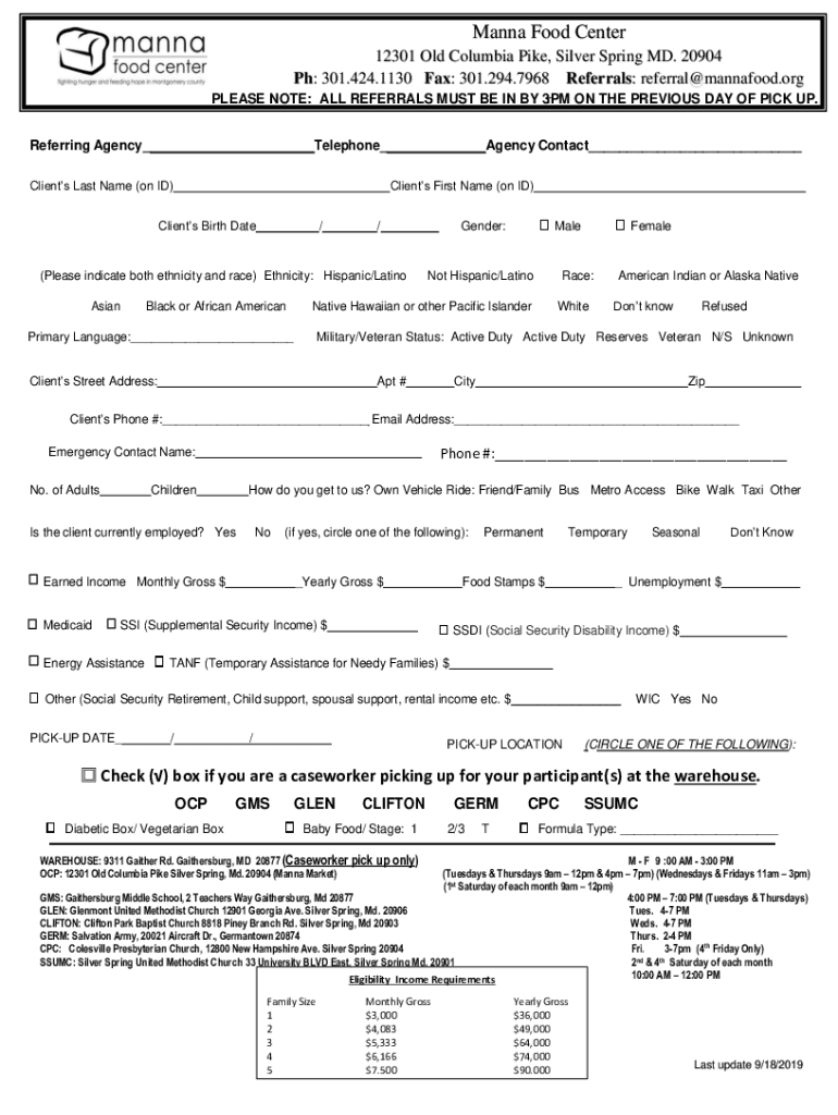 Manna Food Center 12301 Old Columbia Pike, Silver Spring MD. 20904 pH: 301.424.1130 Fax: 301.294.7968 Referrals: referral@mannafood.org r PLEASE NOTE: ALL REFERRALS MUST BE IN BY 3PM ON THE PREVIOUS