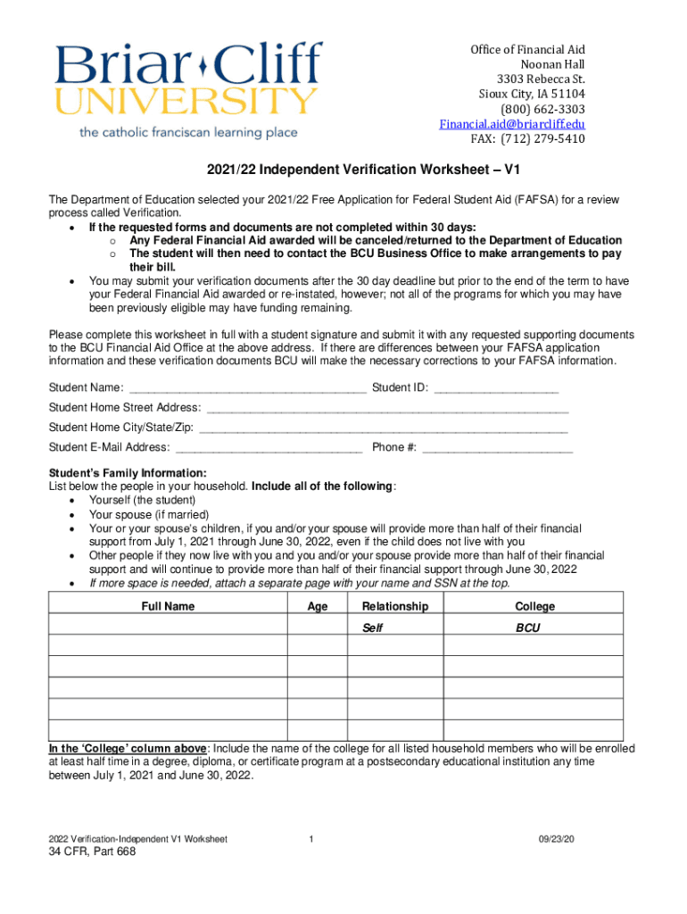 Office of Financial Aid Newman Hall 3303 Rebecca St. Sioux City, IA 51104 (800) 6623303 Financial.aid@briarcliff.edu FAX: (712) 27954102021/22 Independent Verification Worksheet V1 The Department