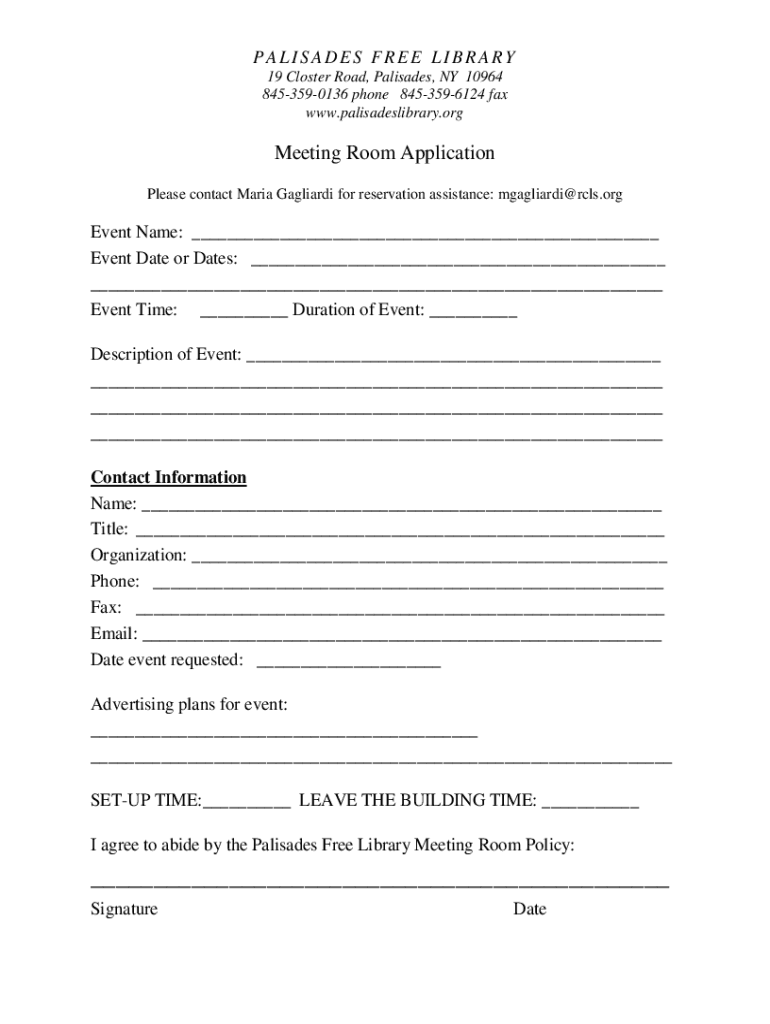 PALISADES FREE LIBRARY 19 Closer Road, Palisades, NY 10964 8453590136 phone 8453596124 fax www.palisadeslibrary.orgMeeting Room Application Please contact Maria Cagliari for reservation assistance: