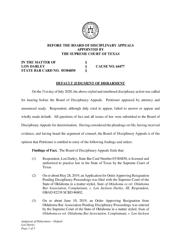 Get the free Darley Default Judgment of Disbarment Signed.pdf